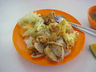 あさり、キャベツ、卵焼き、チキンのから揚げ
