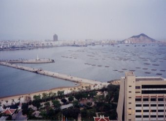 | 海苔の養殖いかだと、右には南海ホテル | 南海ホテルと蛇口の船着き場(小さなホバークラフト船が停泊している。香港まで約1時間) |